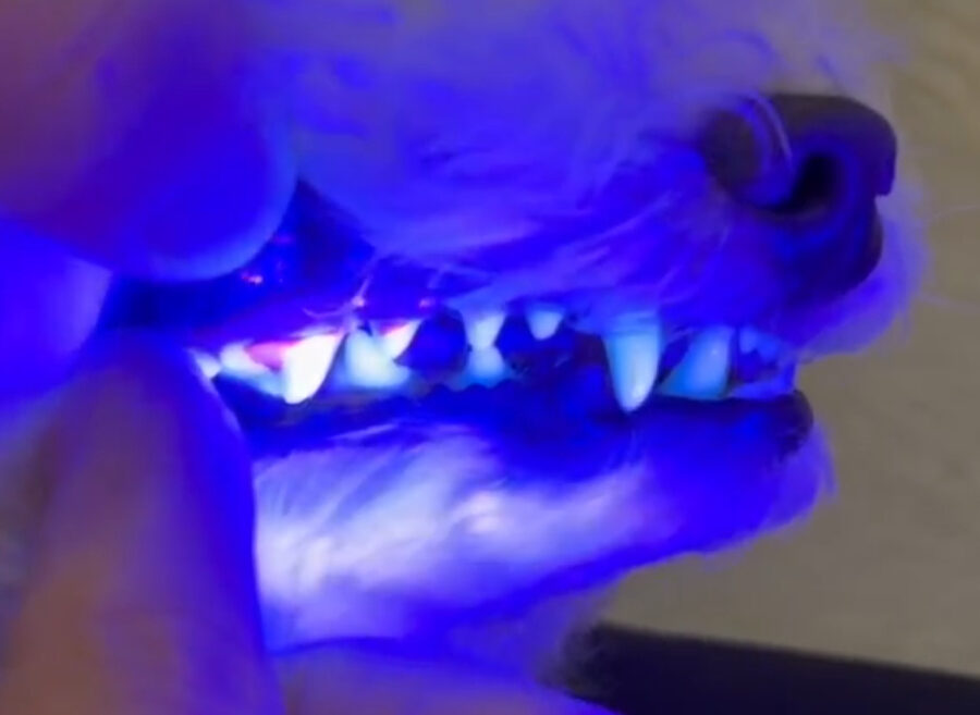肉眼では白くて見えにくいプラーク(細菌の塊)ですが、特殊な光を当てると、細菌が出す代謝物がピンク色に光ります。